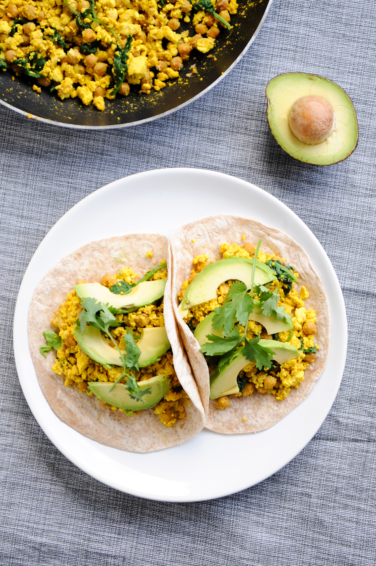 - Verwarm een taco kort in een koekenpan en schep er een paar lepels van de scrambled tofu mix op. Garneer met barbecuesaus, stukjes avocado en koriander.